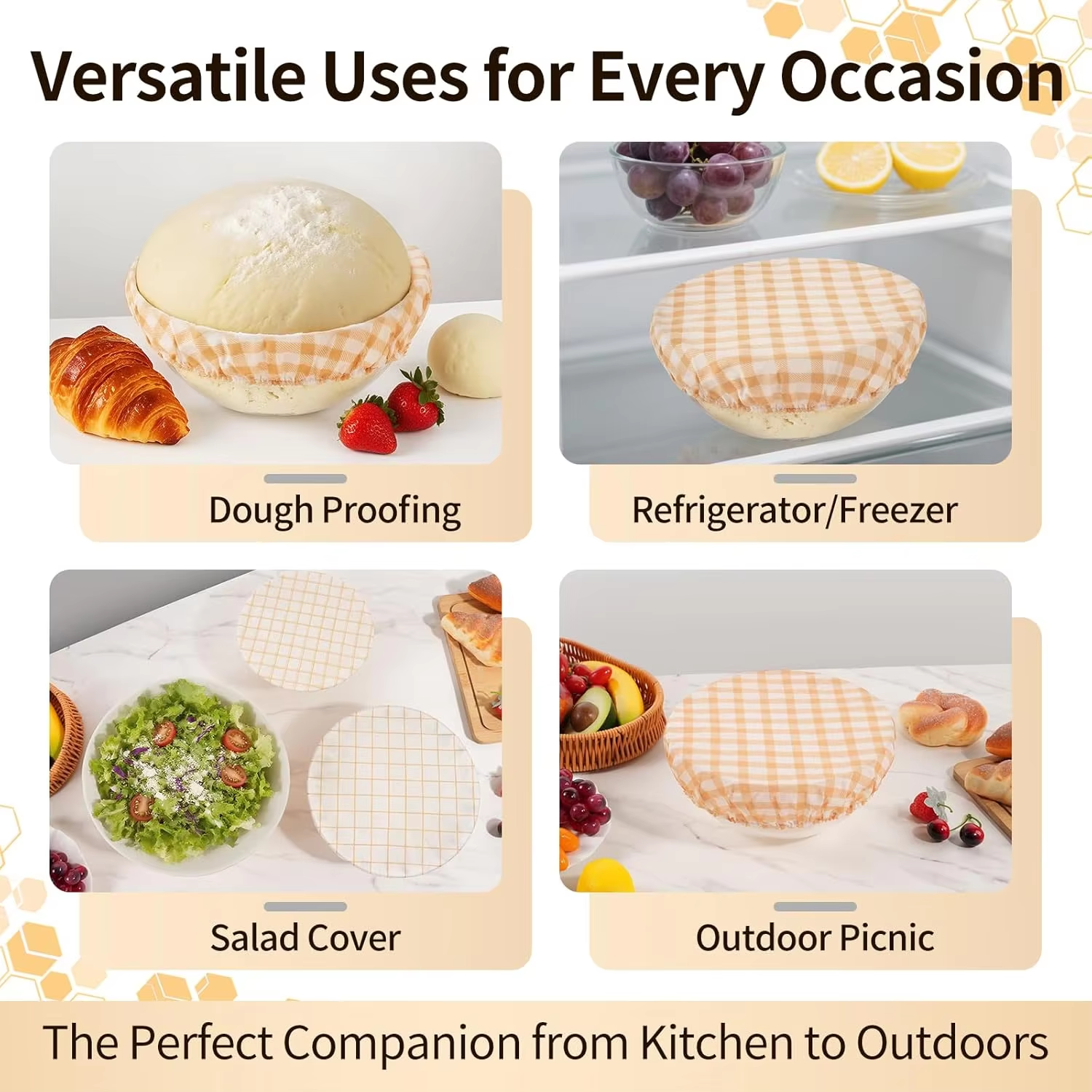 3.With an elastic design, these bowl covers are stretchable, ensuring a secure, snug fit on different-sized bowls, ideal for elongating the life of your tableware.