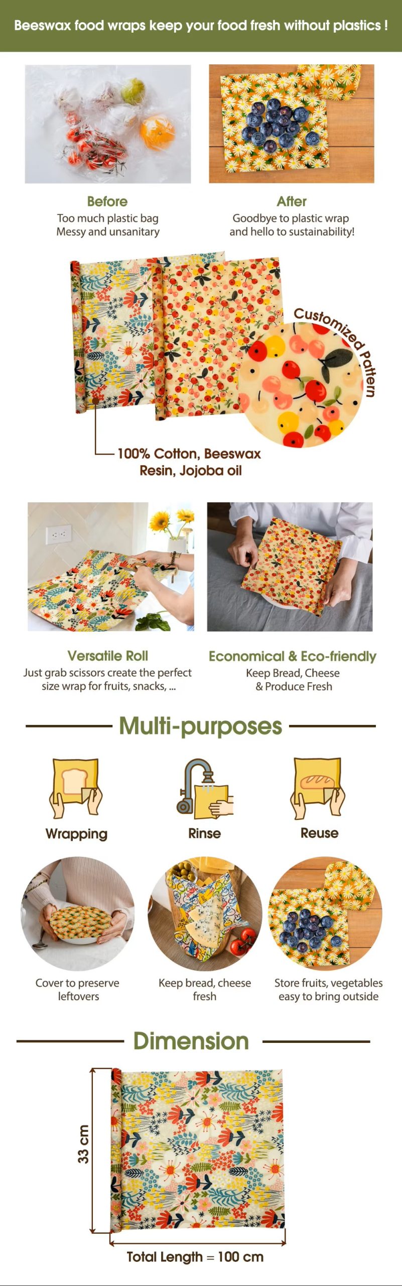 This medium roll of customized pattern beeswax food wrap is made of soft cotton material, reusable and eco-friendly, perfect for wrapping food, covering bowls, and keeping produce fresh in the kitchen