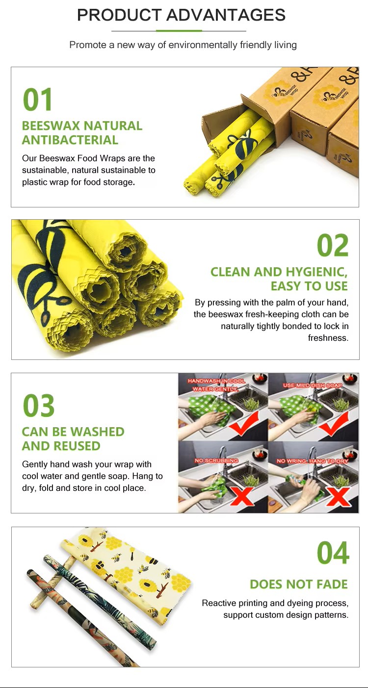 This eco-friendly beeswax wrap is 100% organic, biodegradable and reusable, designed for multifunctional food freshness preservation. Lightweight and foldable, it’s a perfect plastic-free alternative